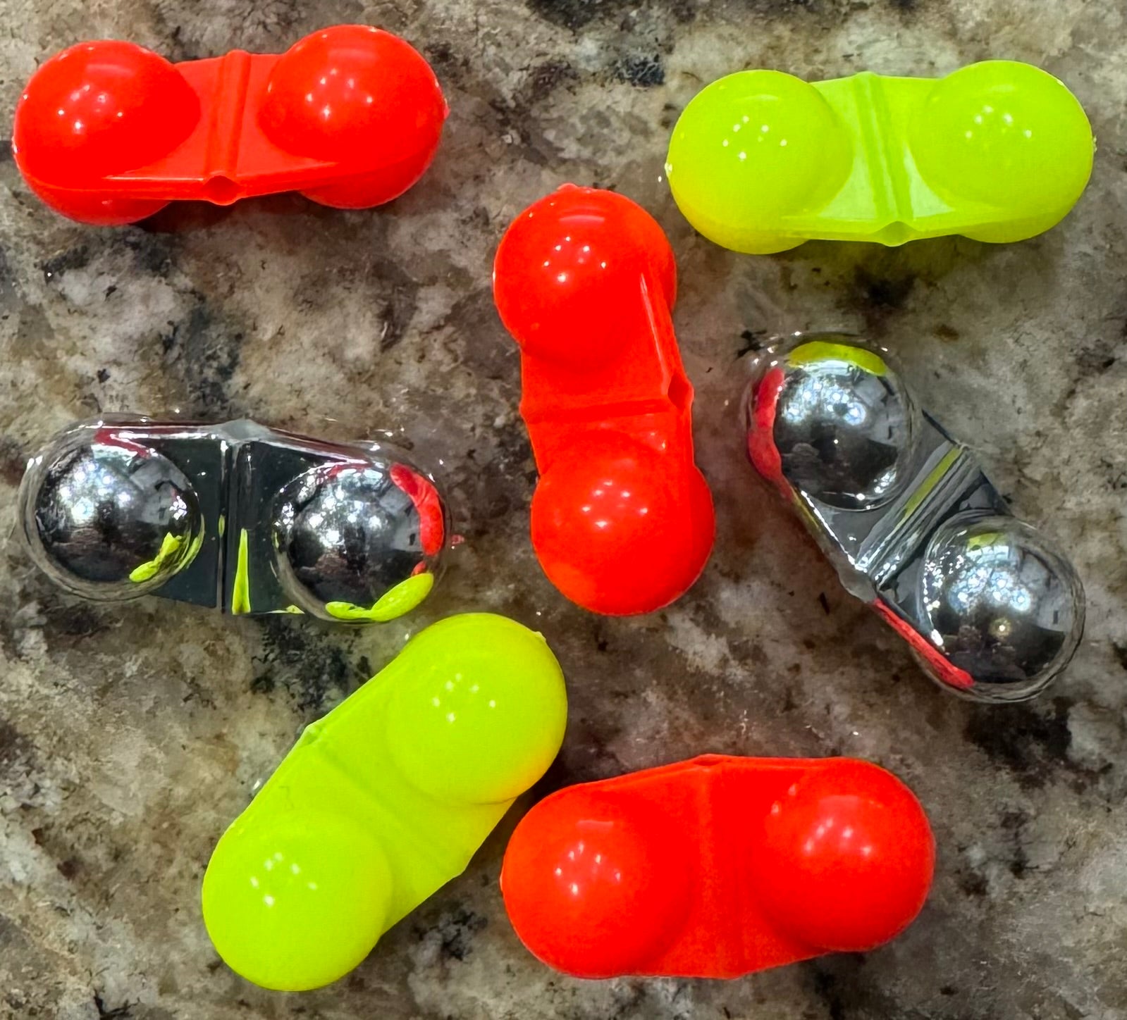 Double Chamber line Rattles slides onto your fishing line rigs to rattle and attract fish. Available in four different color, all packs of 50.